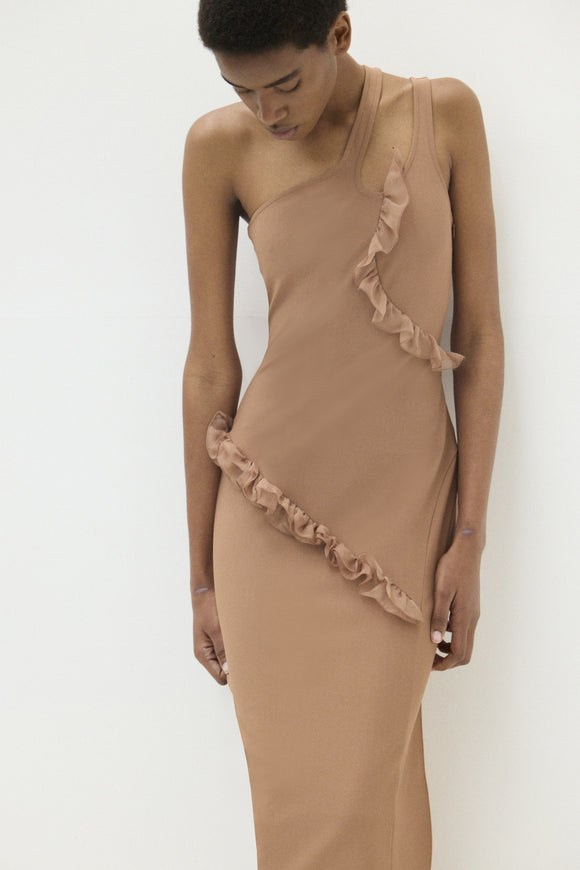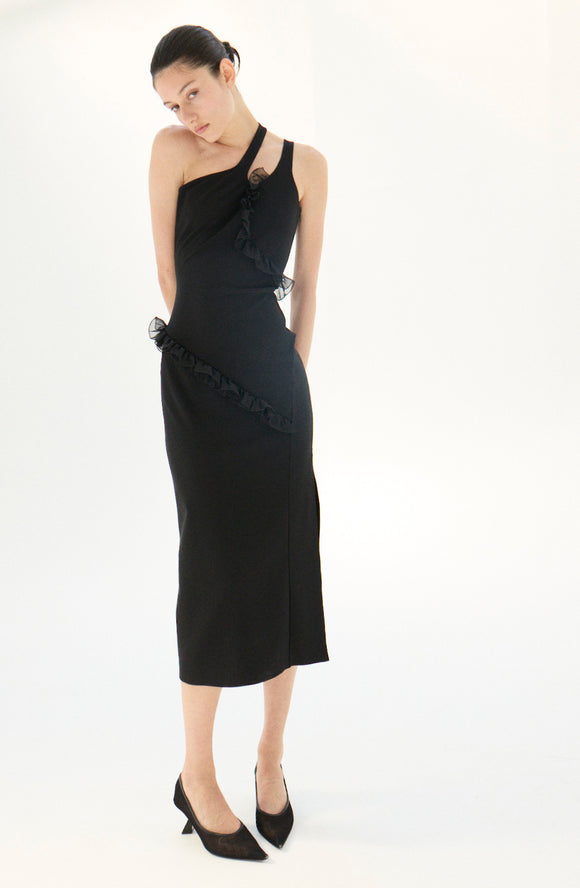NADIA ASYMMETRIC MIDI DRESS WITH FRILLED TRIM