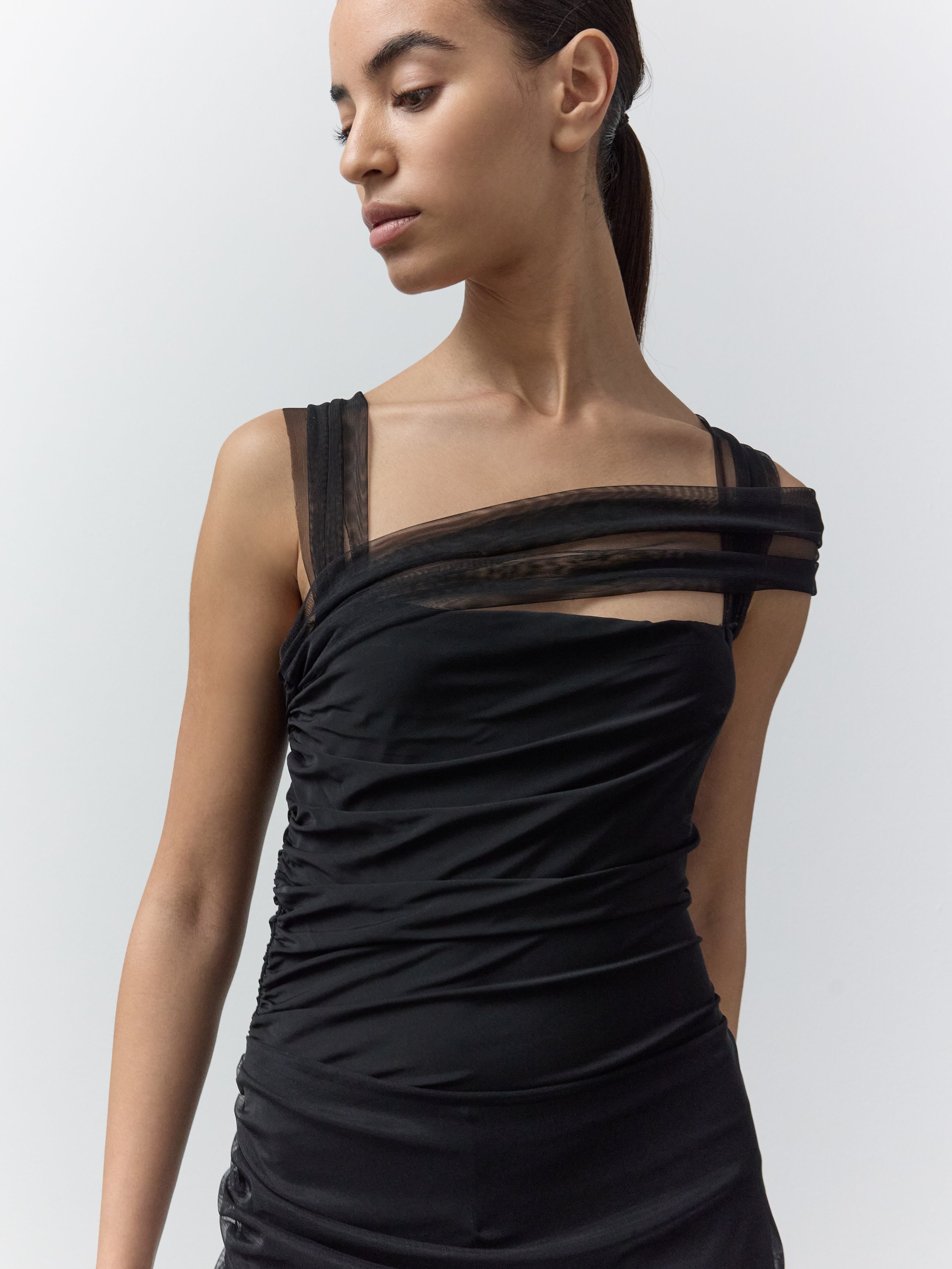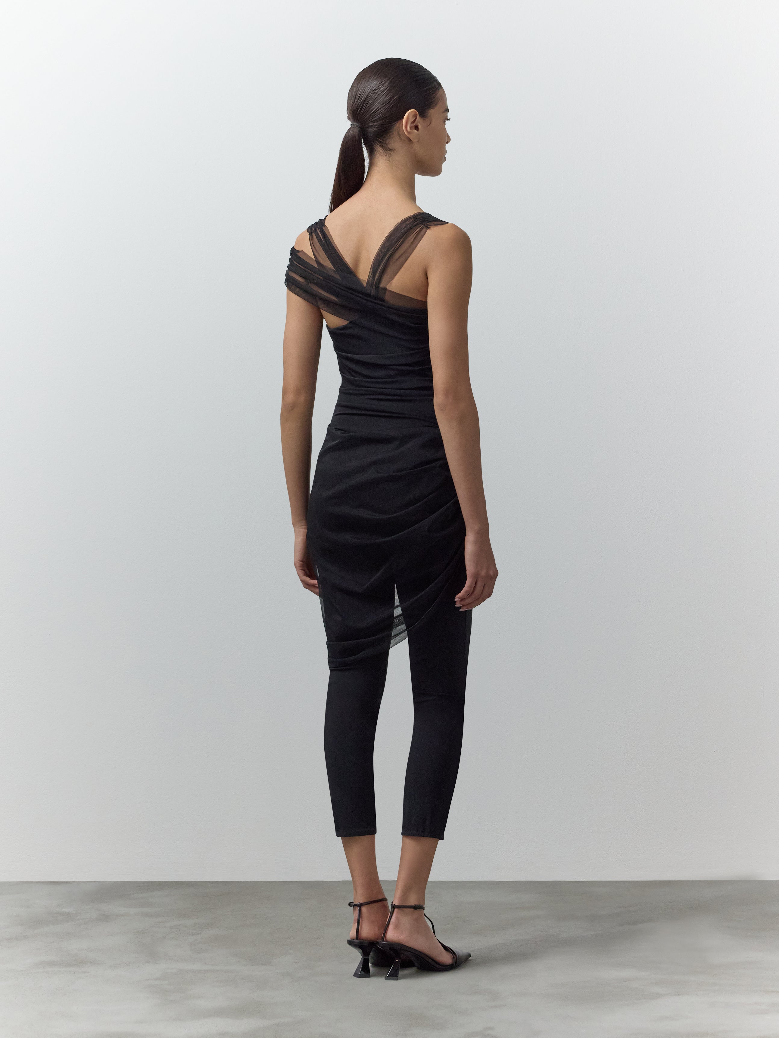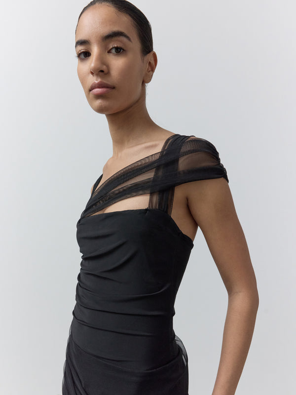 RUCHED BODYSUIT WITH DRAPED SHOULDERS